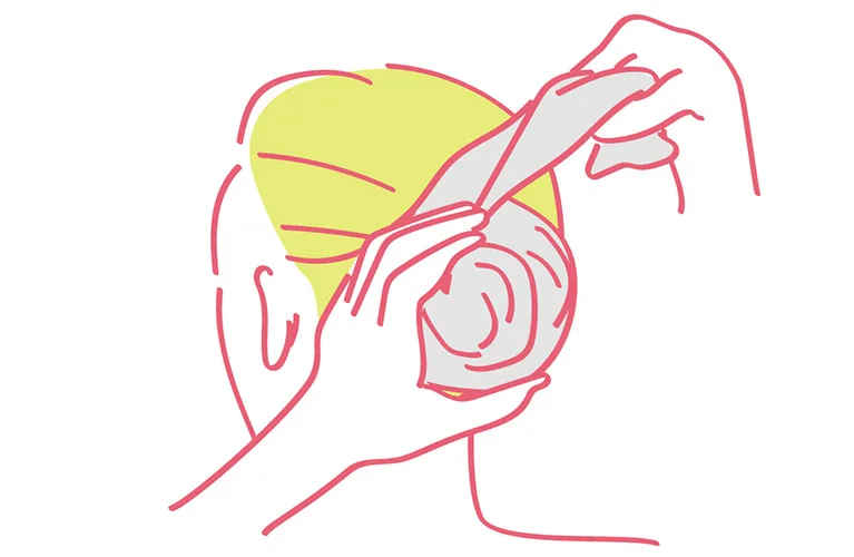 髪にタオルを巻き付けてお団子結びのようにまとめ、タオルに水分を吸わせます。その時、タオルで髪を擦り過ぎないようにすることが大切です。