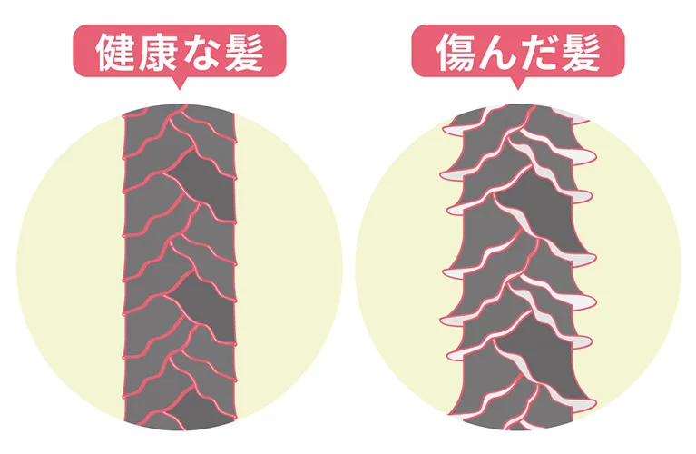 髪はキューティクルという組織に包まれた状態にあります。 キューティクルは、入浴して髪が濡れると開き、ドライヤーで髪を乾かすことによって閉じます。