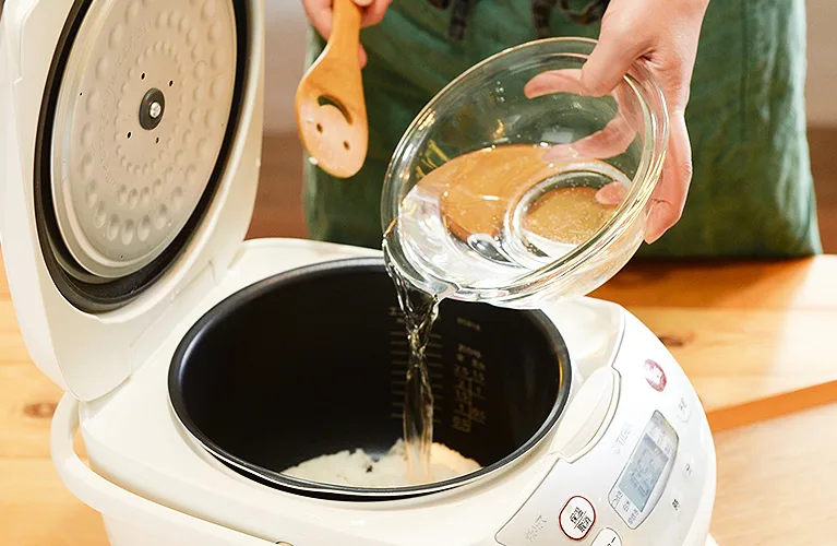 お米2合を通常通りに炊きます。炊けたら水を加え、しゃもじで全体を均等に混ぜます。