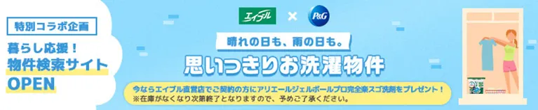 お部屋探しなら、アリエール×エイブルがコラボした晴れの日も雨の日も、いつでも快適にお洗濯できる物件情報サイト「思いっきりお洗濯物件サイト」で検索しよう!