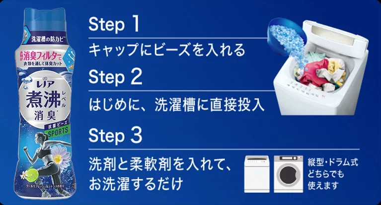 実際にmne_roomさんに「レノア煮沸レベル消臭抗菌ビーズ」を試してもらいました! 「レノア煮沸レベル消臭抗菌ビーズ」の使い方は簡単な3ステップ。