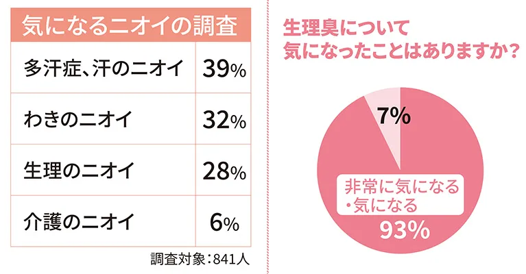 なかでもデリケートゾーンのニオイに関しては、なかなか他人へ相談しにくいですよね。 P&Gが行ったアンケートによると、3割近い女性が汗やわきのニオイなどと同様に、生理中のニオイが気になったことがあるという回答が多くありました。