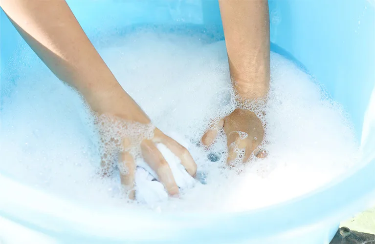 洗濯ネットの端を持ち桶の中で上下させながら、じゃぶじゃぶと洗ってください。 洗い方は洗剤を入れた水を布地の隙間に通すイメージです。