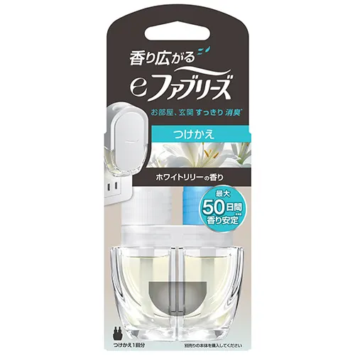いい香りは最初がピーク。そんな常識、変わります!ファブリーズからeファブリーズが発売!コンセントに挿すだけで、電気の力でお部屋に香りと消臭成分を広げ*¹、使い始めのいい香りが最大*²50日間安定して続く!マイクロチップが温度・時間・頻度を自動でコントロールし、交互に加熱することで香料の詰まりを防ぐから、使い始めのいい香りが最大*²50日間安定して続く!これ、もはや家電。*1 13畳まで *2 弱設定において