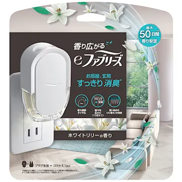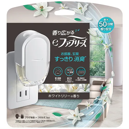 いい香りは最初がピーク。そんな常識、変わります!ファブリーズからeファブリーズが発売!コンセントに挿すだけで、電気の力でお部屋に香りと消臭成分を広げ*¹、使い始めのいい香りが最大*²50日間安定して続く!マイクロチップが温度・時間・頻度を自動でコントロールし、交互に加熱することで香料の詰まりを防ぐから、使い始めのいい香りが最大*²50日間安定して続く!これ、もはや家電。*1 13畳まで *2 弱設定において