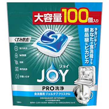 【ジョイジェルタブクリスタルで予洗いなし!新品級にピカピカ!*】ジェルと粉末の2種類の洗浄成分を配合したジェルタブから、ジェルタブクリスタルが登場!あなたの食洗機で洗っても、予洗いなしでくすみも汚れもすっきり落とす。*油汚れ・こびりつき汚れ・茶渋&コーヒー渋の三大汚れについて