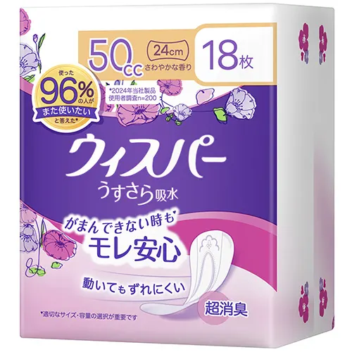 ・我慢できないときもモレ安心。超消臭。・ぎっしり詰まった「強力吸収体」だから、しっかり吸収。・スピード吸収でぬれ感防止。・「ヨレ防止スリムシート」だから、動いてもよれにくい。・横モレ防止デザインで横モレを防止。<製品ラインナップ> ・ウィスパー うすさら吸水 50cc 18枚 少量用 ・ウィスパー うすさら吸水 50cc 38枚 少量用 ・ウィスパー うすさら吸水 50cc 54枚 少量用