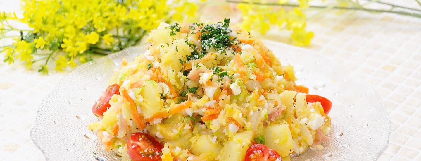 カロリーが気になる方や、マヨネーズが苦手な方にもぴったり。 にんじん・キャベツ・ベーコン・じゃがいもと色とりどりの楽しいポテトサラダです。