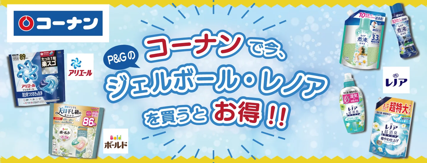 P&G製品を買うなら、コーナンでお買い物しませんか? 今ならアリエールやボールドのジェルボール、そしてレノアの抗菌ビーズや柔軟剤が超お買い得です。今すぐコーナンにP&G製品を買いに行こう!
