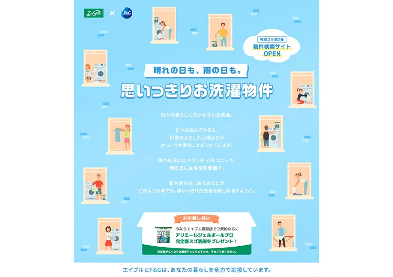 これから新生活をはじめる方に快適な洗濯時間を提供したいという想いから、アリエールと「お部屋探しのエイブル」がコラボ。