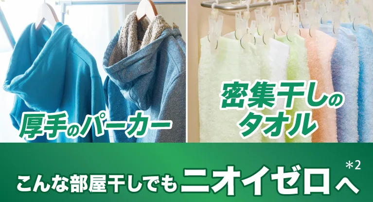 さらに、「アリエールジェルボール プロ部屋干し」は、部屋干しでもさわやかな香りで、乾きづらい厚手の衣類やタオル、または密集した部屋干しでも、ニオイゼロへ*2!
